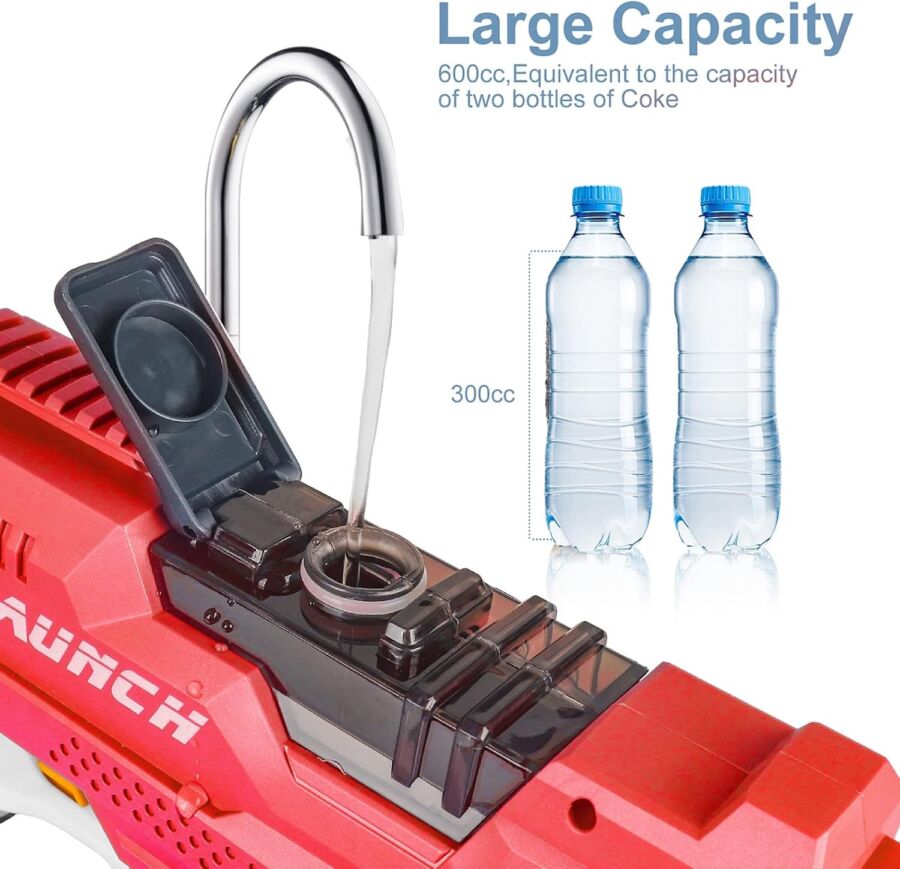- Νεροπίστολο μεγάλης χωρητικότητας: Ένα πλήρες ηλεκτρονικό νεροπίστολο εκτοξεύει περίπου 150 ριπές νερού πριν το ξαναγεμίσει με μια δεξαμενή νερού 600ml.