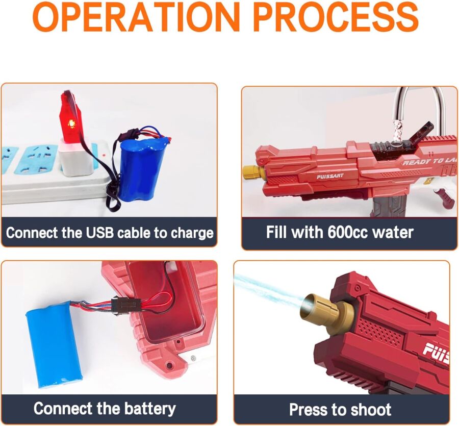 - Υψηλή πίεση και ισχύς: Η ροή νερού που εκτοξεύεται από το πιστόλι νερού είναι πολύ γρήγορη επειδή στο εσωτερικό του υπάρχει ένας ισχυρός κινητήρας και μια μπαταρία.